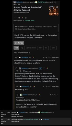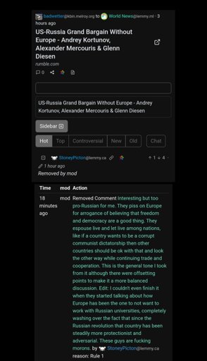 arrow-up11arrow-down1imageLemmy.ml: "Don't even allude to Russia being the bad guy, CENSORING AND 30 DAY BAN"plus-squarelemmy.worldcm0002@lemmy.worldEnglish · 11 months agomessage-square0fedilink