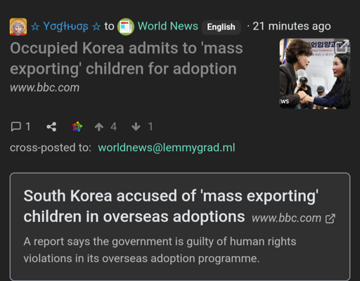 cm0002@lemmy.worldEnglish · edit-211 months agoAltering a headline in this manner to push the propaganda narrative that NK isn't a dictatorship and that SK are actually the true "occupiers" would get you banned on unbiased comms/instancesplus-squarelemmy.worldimagemessage-square0fedilinkarrow-up11arrow-down10