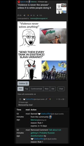 arrow-up11arrow-down1imageOnly on .ml and the rest of the Triad is calling out disinformation/propaganda grounds for content removal and a ban...for the person calling it out that is lolplus-squarelemmy.worldcm0002@lemmy.worldEnglish · edit-211 months agomessage-square0fedilink