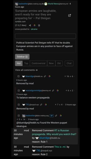 arrow-up11arrow-down1imageIf you call out literal Russian propaganda (RT/Rumble) on .ml YOU'LL get the bans and comment removal, not the propaganda!plus-squarelemmy.worldcm0002@lemmy.worldEnglish · 11 months agomessage-square0fedilink