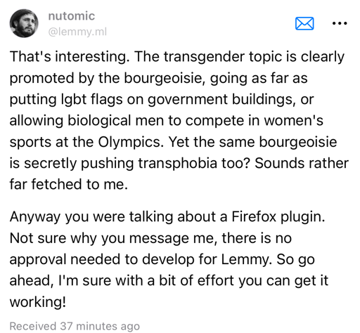 arrow-up11arrow-down1imageReminder that Nutomic has posted transphobic comments publicly calling trans women "biological males" while denying the existence of transphobia in the governmentlemmings.worldterusgormand8465@lemmings.worldEnglish · 11 months agomessage-square0fedilink