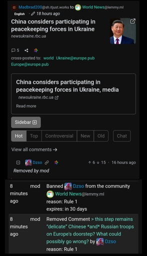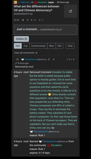 arrow-up11arrow-down1imageTalking about the heavy handed control of the Chinese government? On a comm on lemmy.ml‽ That's a (Rule 1) banning!plus-squarelemmy.worldcm0002@lemmy.worldEnglish · 11 months agomessage-square0fedilink