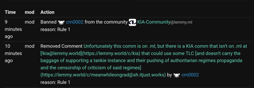 arrow-up11arrow-down1image(Re) Banned from a bunch of .ml comms for posts and comments no where near .ml, just like Reddit mods lolplus-squarelemmy.worldcm0002@lemmy.worldEnglish · edit-211 months agomessage-square0fedilink