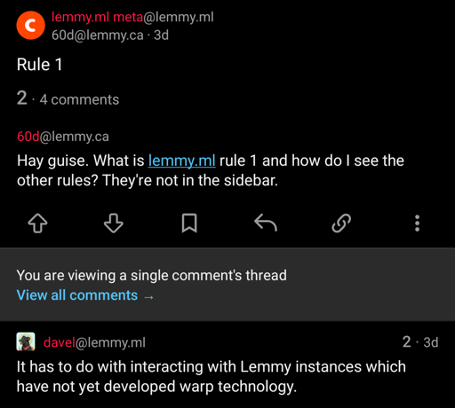 arrow-up11arrow-down1imageGuess the "real" reasoning behind "Rule 1" is that they have it in place because other Lemmy instances aren't 'enlightened' enoughplus-squarelemmy.worldcm0002@lemmy.worldEnglish · 11 months agomessage-square0fedilink