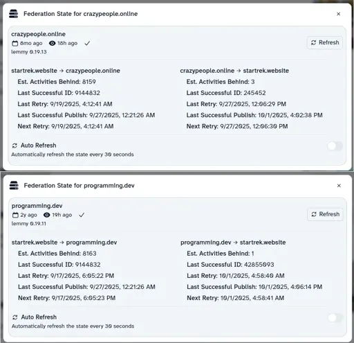 arrow-up11arrow-down1imageOutbound federation to crazypeople.online and programming.dev seems to have stopped?plus-squarestartrek.websiteIced Raktajino@startrek.websiteEnglish · edit-22 months agomessage-square0fedilink