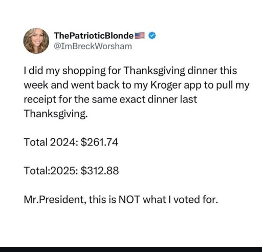 It would be straight up LAMF if the tariffs were front of mind when they voted. But inflation was what they were most concerned with, and they either didn’t pay attention to Trump’s tariff talk or assumed it wouldn’t be them paying the tariffs… you could say it’s not directly LAMF because people don’t understand the connection between higher tariffs and higher prices, but definitely LAMF adjacent because of the widespread assumption that people in other countries would be paying the tariffs, not them.
