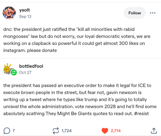 Officials are actively going against MAGA, esp. ICE, right now. It’s not all just tweets. But Trump won twice with the help of social media; other parties embrace it, too. Hopefully in a better way (and I’m not sure Gavin Newsom’s is it).