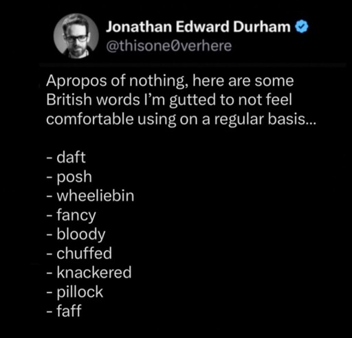 Ain’t no shame in borrowing good slang, and that’s something brits do extremely well imo. It’s usually easy to use, rolls off the tongue, and sounds just silly enough.