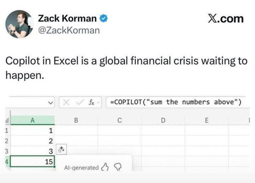 minus-squareZoteTheMighty@lemmy.ziplinkfedilinkarrow-up4arrow-down1·2 days agoIt probably converted the prompt to 15 instead of a SUM call. The ultimate point that it could actually cause a financial crisis because of something like this still stands.