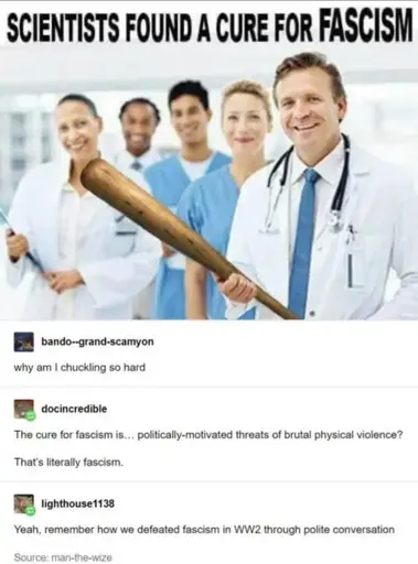 No one in this whole reply chain said that. Even if they did, I usually interpret people’s words, so when someone says “sitting at the table with a nazi makes you a nazi” it means to me “not fighting evil makes you complicit in that evil.” If they mean it literally makes you a nazi, then they are wrong, but I usually assume people aren’t saying things that are insane since everyone I have talked to when asked has said the 1st one.