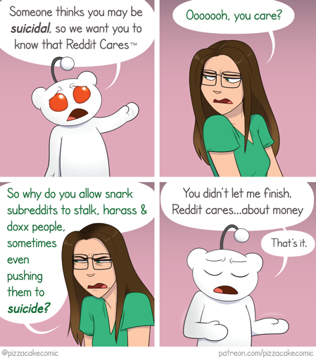 Anti-suicidal notifications are one of the least messed up things in the Reddit administration system for now, since dealing with literal AI banning you for nothing is much worse.