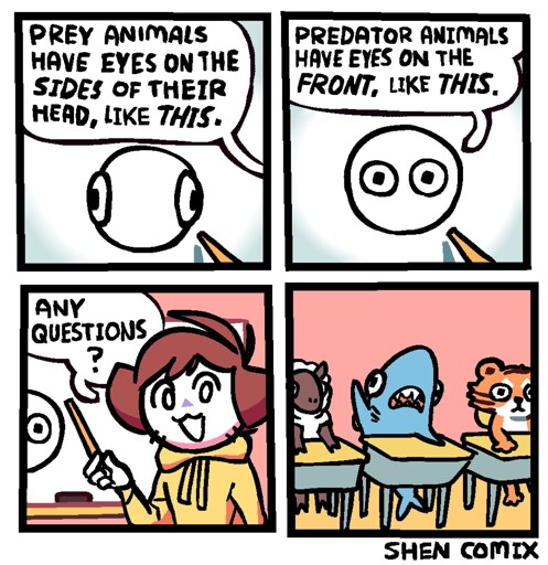 My point is that they’re entirely forward facing. Calling it a mammal rule isn’t really accurate. It’s about whether or not the animal needs to judge distance to attack. Sharks use their vision to scan for prey above and below them, but they use their other sense to attack. Hawks and cats have a significantly different sense of vision, but both need to be able to accurately judge distance with their eyes when attacking.