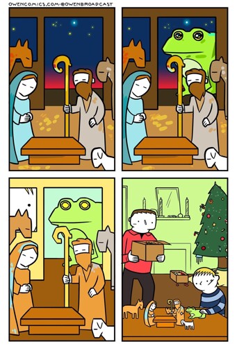 I’m an Episcopal priest. At a parish I served in some years back, we had a custom of giving kids animals from the nativity scene to carry in procession and place around the manger at the Christmas Eve service. I would be at the end of the procession to place the Christ child in the manger and then cense the scene before saying the opening prayers. I do so and happen to catch something out of the ordinary: a tiny rubber dinosaur has somehow made it into Bethlehem. So I start the service by noting this and the church has a good chuckle.