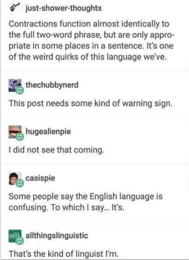 “It’s” specifically is funny because you can use its alternative version “'tis” in some places that you cant use “it’s”.
