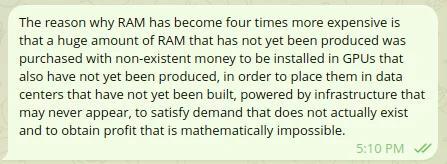 I’m not too worried though for two reasons. First, I’m confident they’ll eventually be in breech of their memory contracts for being unable to pay - as the whole AI market is a house of cards, and has no real path to profitability beyond hopes and dreams. Banks and angel investors will eventually start asking ‘where are the profits’ and begin pulling out the rug. Second, the chip suppliers began ramping up production (as you suggest) some time back, so the current crazy price increase should only be temporary once they have increased supply output in a year or so. They would have to sign new contracts to get their ‘40% deal’ again, and the memory giants will have much higher price demands for any such deals in future, and I don’t think OpenAI will have the money.