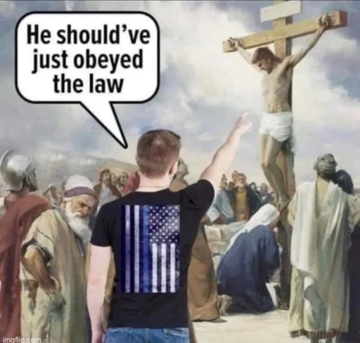 Scene with Jesus on the cross. A MAGA person wearing a thin blue line flag shirt pointing at Jesus saying “He should have just obeyed the law!”