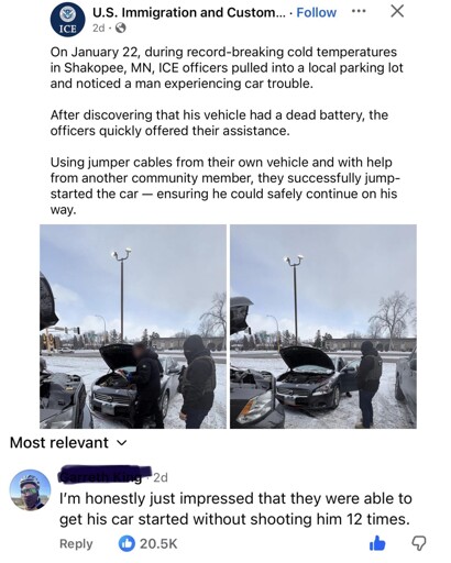 That ICE guy totally didn’t know how to use the jumper cables. “With help from another community member”, pictures with ICE guy standing around watching.