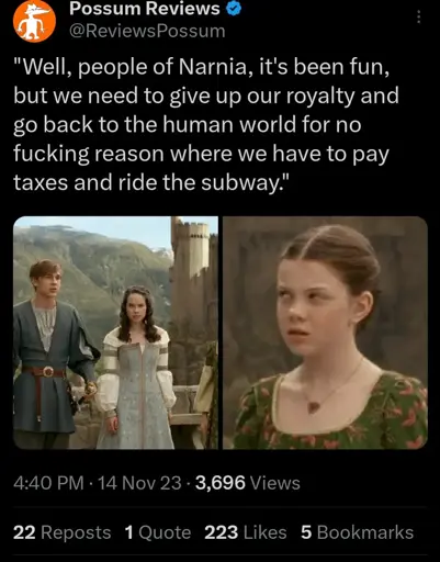 Yeah I think based on the later books, Peter would’ve been at most like maybe early thirties but probably only late twenties by the time they leave Narnia. And Lucy would’ve been like early to mid twenties. So they were adults, but certainly not old. In fact, it’s mentioned that Susan was courted by many princes and in The Horse and His Boy (warning: it’s super fucking racist and Islamophobic) she’s genuinely considering marrying someone but it turns out he’s pretty horrible. Right after the events of The Horse and His Boy, the kids hunt the white stag, see the lamppost, dimly remember the Wardrobe and end up back in our world