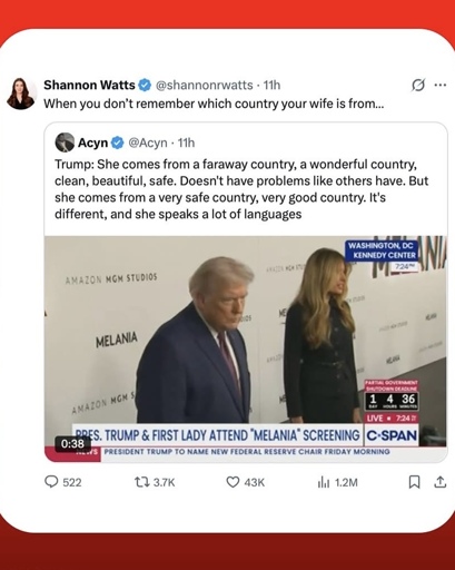 “That woman over there whose name I know, believe me, is from the country of… Melania? Hold my hand, …you.”