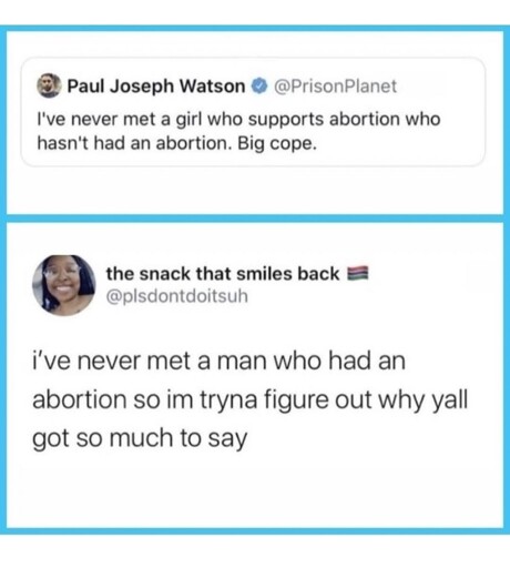 “My son is an uninformed misogynist and has no chance to give me grandchildren. All that time raising him, wasted on a brainless loser. And now, he definitely knows a woman who supports abortion but hasn’t had one.” - That guy’s mom after reading his post, probably.