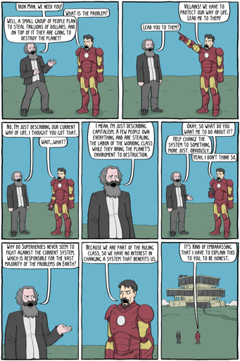 The only supervillain I attribute to Tony’s actions as Iron Man is Ultron, and Ultron definitely isn’t a manifestation of Capitalism and the current world order. This comic is arguing that superheroes enforce the status quo, but I don’t believe Iron Man has acted to enforce the status quo through his superheroics. Your argument that he created those supervillains doesn’t convince Me either.