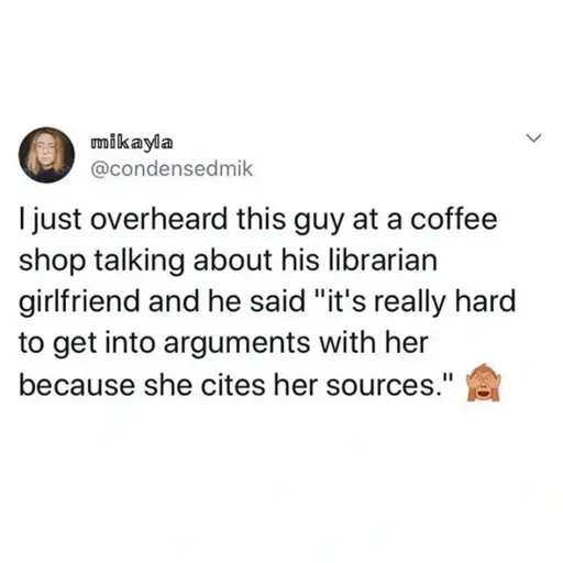 I’m not a librarian, but my friends have realized I won’t die on a hill unless I can prove I’m right with citations. If I’m not super sure I’ll qualify things with “if I recall correctly” or “I’m pretty sure” while actively looking the thing up, and will say “nope sorry I was wrong/only partially correct, here’s the context I was missing”