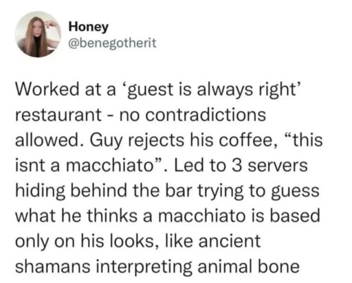The customer leaves in a huff. “J” looks at me and says, “Just because the ‘customer is always right’ doesn’t mean they get to treat you like shit. He can go to hell. We don’t need his money.”