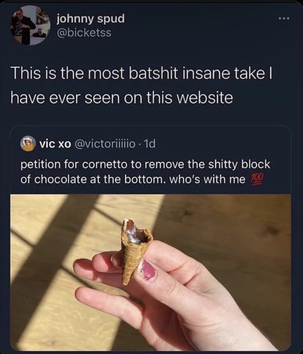minus-squareBearGun@ttrpg.networklinkfedilinkarrow-up2·6 months agoI used to eat about a third off the top, bite off the bottom, then suck the rest out through the hole. Then you had a nice soft chocolate wafer with a bit of ice cream coating it left.
