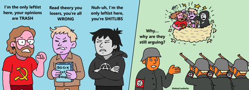 [dude in an anarchist hoodie, arguing] Nuh-uh, I’m the only leftist here, you’re SHITLIBS