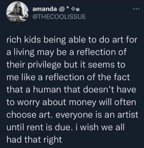 also i can’t help but say “look. there’s much worse things for the fucking yuppy kids to do than make art. they could go into real estate, or military advancements. every lucky baby ducky making art about how fucked the world is is a tiny victory. they should do more to make room for the rest of us, but they literally have so much privilege they don’t know how. don’t make hating them your top priority in this global system of violence”