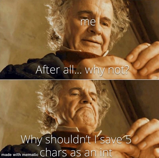 Did you ever saw a char and thought: “Damn, 1 byte for a single char is pretty darn inefficient”? No? Well I did. So what I decided to do instead is to pack 5 chars, convert each char to a 2 digit integer and then concat those 5 2 digit ints together into one big unsigned int and boom, I saved 5 chars using only 4 instead of 5 bytes. The reason this works is, because one unsigned int is a ten digit long number and so I can save one char using 2 digits. In theory you could save 32 different chars using this technique (the first two digits of an unsigned int are 42 and if you dont want to account for a possible 0 in the beginning you end up with 32 chars). If you would decide to use all 10 digits you could save exactly 3 chars. Why should anyone do that? Idk. Is it way to much work to be useful? Yes. Was it funny? Yes.