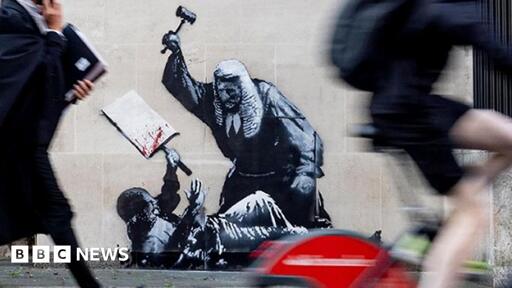 The artwork, which shows a judge hitting a protester with a gavel, was confirmed by the elusive street artist.