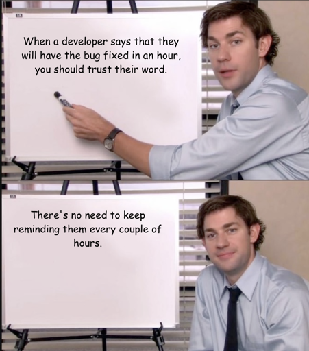 I get this is meant as a joke about how difficult is it to estimate things, but this isn’t on anyone but me and making sure I am communicating my progress. Anyone who has the title of senior developer and disagrees is senior in name only.