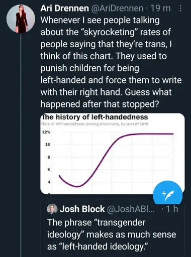 It’s all about religion. Jesus sits on the right hand of God, Satan sits on the left. Left handed children were seen to agents of Satan. Trans is an abomination because God only created Adam and Eve. I’m sure there are passages in the Bible that will eventually be discovered making them ok, much like abortion: the Bible contains instructions on how to induce an abortion. Personally I think the best argument is to tell evangelicals that a miscarriage is an abortion by God. For whatever his unknown reason, he has decided this child should not be born. If abortion is ok with God, it’s ok with me.