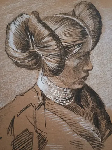 Carbon pencil and white charcoal on tinted paper. A tricky portrait for me, as the face is largely in shadow and the facial planes are a little unclear. A fun exercise for practicing hair.