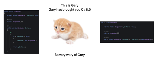 The only part that has me stumped is the unary question-mark operator: privatestatic Singleton? _instance = null; I can think of a half-dozen things that could be, but I cannot decide what it’s doing that the original question-mark-free version isn’t.