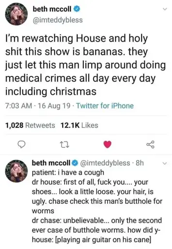 arrow-up11.05Karrow-down1imageAn accurate representation of House M.Dlemmy.dbzer0.comStamets@lemmy.dbzer0.com to People Twitter@sh.itjust.works · 8 days agomessage-square109fedilink