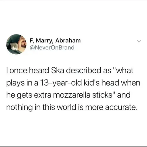arrow-up1707arrow-down1imageSka still slaps thoughlemmy.dbzer0.comStamets@lemmy.dbzer0.com to People Twitter@sh.itjust.works · 7 days agomessage-square88fedilink