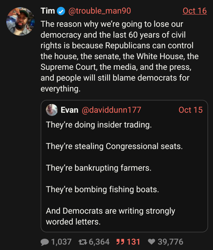 Probably because we elected the Dems to do something and they put their top man, Merrick Garland, on it and he did jack shit for two years. Biden also knew the court was fucked and refused to do anything about that. Also he did nothing to differentiate himself from the fasc and actively did a genocide and border fascism. Then he refused to give up power and handed his campaign over to a person who refused to distance herself from him.