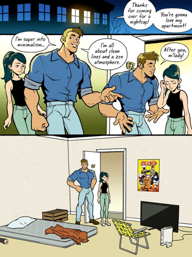 This comic plays with expectations in a clever, visual punchline. The woman expresses her love for minimalism and zen design, setting up an image of sleek, curated interiors. But when they enter the man’s apartment, it’s minimalism in the most literal—and hilariously underwhelming—sense: a bare mattress, a lawn chair, and a single poster of cartoonish musclemen.