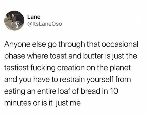 minus-squareEtterra@discuss.onlinelinkfedilinkEnglisharrow-up2·1 month agoButtered toast with peanut butter. If you can get some homemade apple butter to make it a sandwich, now that’s the best thing ever.