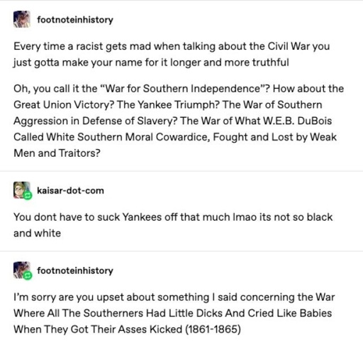 - “Not so black and white?” Friend (derogatory), it’s literally one of the two black and white things we all agreed on until like 10 years ago - While you’re exactly right on the topic, your timing’s a bit off. - Racist American assholes have been lying about the civil war since 1865. - Yes, and in the deep red rural area where I grew up there were a few people who did, but they were very widely recognized as fringe.