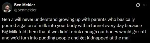 I’m on the older end of Gen Z and this was definitely a thing when I was little. My parents didn’t buy into the milk thing, but I had a teacher who went wild with it. I forget how exactly it happened, but she found out I had cereal for breakfast without milk poured on because that was how I liked it. She decided this meant my parents were neglecting my needs and that it was her job to “make up” for it during lunch time.