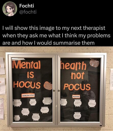 MENTAL IS HOCUS HEALTH NOT POCUS WHEN YOU’RE IN CLASS WHY CAN YOU NOT FOCUSSOMETIMES I FIND THESE LINES TO BE BOGUS ALIGN YOUR TEXT TO THE EYE’S LOCUSLEFT TO RIGHT WITHOUT SEPARATION OR YOU’LL FIND CONFUSION HAS BECOME LIFE’S STATIONHOCUS POCUS HOCUS POCUS MENTAL IS HEALTH AND HEALTH IS NOT POCUSMore like !nosafetysmokingfirst@sh.itjust.works, since it reads correctly left to right, but the divider leads one to try and read it top to bottom.