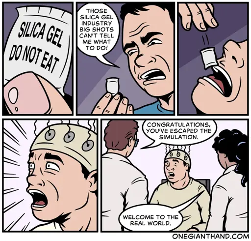 “What do you mean capitalism also exists in the real world? Are you sure we don’t need to eat more silica gel packets? How deep does this shit go?!”