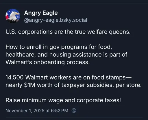 This is the very horseshit that the American K-12 public school system brainwashed me into thinking was “socialism”. SNAP is a governmental bandaid that exists as a symptom of a labor market predated upon by the already wealthy.