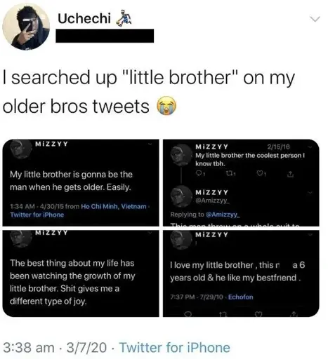 That’s sweet. My older brother just beat me up because he had misplaced aggression and needs more love from our dad.