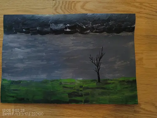 Photo of this had the colors changing too much. This version I tinkered with f stop and white level to get it closer, but still a little off. I’m not sure l like how well defined the tree is versus the more abstract-ness of the sky and ground. This is using acrylic for the black and white, and watercolor from a tube for the green. I’m thinking I need a finer bristle brush. Comments or recommendations are appreciated.