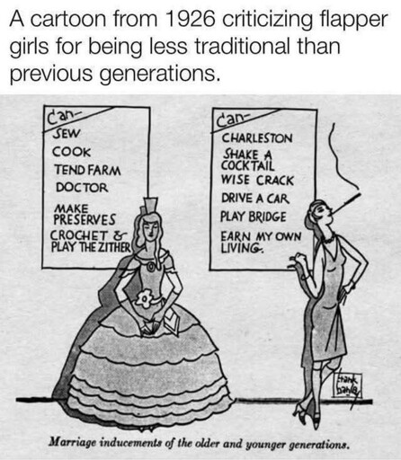 Ya know, I’m not so sure that the old comic is necessarily just criticizing flapper girls. The way I understand the bottom text is “These are the qualities that women of these generations need to have to make men want to marry them”, so I think it’s also saying that the young men nowadays have wacky tastes as well.
