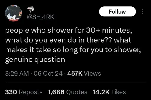 arrow-up1170arrow-down1imageI can undress, shower, dry and dress in less than 10. WHAT ARE YOU DOINGlemmy.dbzer0.comStamets@lemmy.dbzer0.com to People Twitter@sh.itjust.works · 14 hours agomessage-square119fedilink